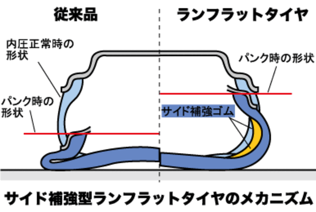 また、一部の高級車にはランフラットタイヤが採用されています。