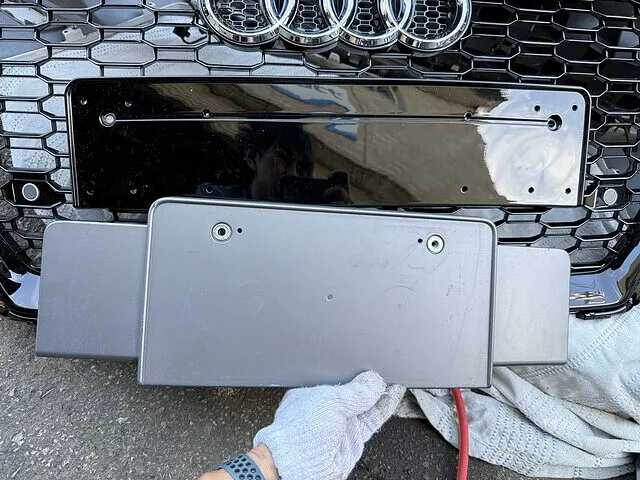ナンバープレートが付く部品を新しいグリルに移植していきます